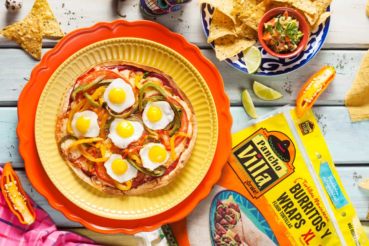 Disponer una tortilla sobre una lata para horno y esparcir 2 cdas. de salsa de tomate sobre ésta, dejando un borde de 1 cm. Cubrir con parte de queso mozzarella, rodajas de tomate, orégano y pimentones.